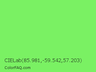 CIELab 85.981,-59.542,57.203 Color is a light green color and the nearest color is Screamin Green #66ff66. Hex code #7af163 and RGB value is rgb(122,241,99). In RGB color space, this color is composed of 48% red, 95% green, 39% blue, In CMYK color space, this color is composed of 49% cyan, 0% magenta, 59% yellow , 5% black , In HSL color space, this color has a hue angle of 110° , 84% saturation and 67% lightness.