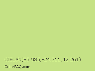 CIELab 85.985,-24.311,42.261 Color is a light lime color and the nearest color is Medium Spring Bud #c9dc87. Hex code #c5e285 and RGB value is rgb(197,226,133). In RGB color space, this color is composed of 77% red, 89% green, 52% blue, In CMYK color space, this color is composed of 13% cyan, 0% magenta, 41% yellow , 11% black , In HSL color space, this color has a hue angle of 79° , 62% saturation and 70% lightness.