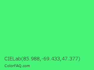 CIELab 85.988,-69.433,47.377 Color is a light green color and the nearest color is Very Light Malachite Green #64e986. Hex code #46f578 and RGB value is rgb(70,245,120). In RGB color space, this color is composed of 27% red, 96% green, 47% blue, In CMYK color space, this color is composed of 71% cyan, 0% magenta, 51% yellow , 4% black , In HSL color space, this color has a hue angle of 137° , 90% saturation and 62% lightness.