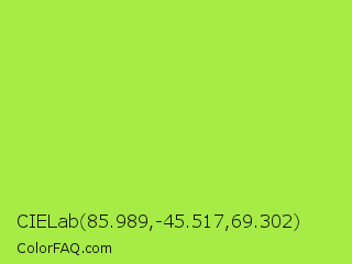 CIELab 85.989,-45.517,69.302 Color is a normal green color and the nearest color is Conifer #acdd4d. Hex code #a6eb46 and RGB value is rgb(166,235,70). In RGB color space, this color is composed of 65% red, 92% green, 27% blue, In CMYK color space, this color is composed of 29% cyan, 0% magenta, 70% yellow , 8% black , In HSL color space, this color has a hue angle of 85° , 80% saturation and 60% lightness.