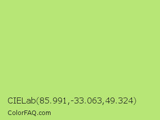 CIELab 85.991,-33.063,49.324 Color is a light green color and the nearest color is Sulu #c1f07c. Hex code #b7e676 and RGB value is rgb(183,230,118). In RGB color space, this color is composed of 72% red, 90% green, 46% blue, In CMYK color space, this color is composed of 20% cyan, 0% magenta, 49% yellow , 10% black , In HSL color space, this color has a hue angle of 85° , 69% saturation and 68% lightness.