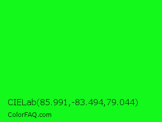 CIELab 85.991,-83.494,79.044 Color is a normal green color and the nearest color is Green #00ff00. Hex code #13f91b and RGB value is rgb(19,249,27). In RGB color space, this color is composed of 7% red, 98% green, 11% blue, In CMYK color space, this color is composed of 92% cyan, 0% magenta, 89% yellow , 2% black , In HSL color space, this color has a hue angle of 122° , 95% saturation and 53% lightness.