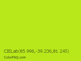 CIELab 85.996,-39.236,81.245 Color is a normal lime color and the nearest color is Inch Worm #b0e313. Hex code #b8e81a and RGB value is rgb(184,232,26). In RGB color space, this color is composed of 72% red, 91% green, 10% blue, In CMYK color space, this color is composed of 21% cyan, 0% magenta, 89% yellow , 9% black , In HSL color space, this color has a hue angle of 74° , 82% saturation and 51% lightness.