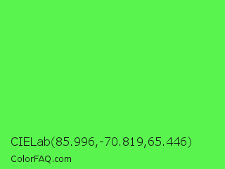 CIELab 85.996,-70.819,65.446 Color is a light green color and the nearest color is Screamin Green #66ff66. Hex code #59f54e and RGB value is rgb(89,245,78). In RGB color space, this color is composed of 35% red, 96% green, 31% blue, In CMYK color space, this color is composed of 64% cyan, 0% magenta, 68% yellow , 4% black , In HSL color space, this color has a hue angle of 116° , 89% saturation and 63% lightness.
