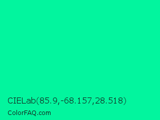 CIELab 85.9,-68.157,28.518 Color is a normal green color and the nearest color is Medium Spring Green #00fa9a. Hex code #02f59e and RGB value is rgb(2,245,158). In RGB color space, this color is composed of 1% red, 96% green, 62% blue, In CMYK color space, this color is composed of 99% cyan, 0% magenta, 36% yellow , 4% black , In HSL color space, this color has a hue angle of 159° , 98% saturation and 48% lightness.