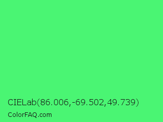 CIELab 86.006,-69.502,49.739 Color is a light green color and the nearest color is Screamin Green #66ff66. Hex code #4af573 and RGB value is rgb(74,245,115). In RGB color space, this color is composed of 29% red, 96% green, 45% blue, In CMYK color space, this color is composed of 70% cyan, 0% magenta, 53% yellow , 4% black , In HSL color space, this color has a hue angle of 134° , 90% saturation and 63% lightness.