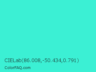 CIELab 86.008,-50.434,0.791 Color is a normal cyan color and the nearest color is Turquoise #40e0d0. Hex code #3bf0d4 and RGB value is rgb(59,240,212). In RGB color space, this color is composed of 23% red, 94% green, 83% blue, In CMYK color space, this color is composed of 75% cyan, 0% magenta, 12% yellow , 6% black , In HSL color space, this color has a hue angle of 171° , 86% saturation and 59% lightness.