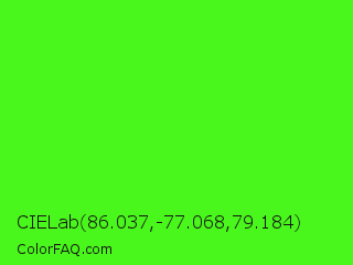 CIELab 86.037,-77.068,79.184 Color is a normal green color and the nearest color is Neon Green #39ff14. Hex code #4af71c and RGB value is rgb(74,247,28). In RGB color space, this color is composed of 29% red, 97% green, 11% blue, In CMYK color space, this color is composed of 70% cyan, 0% magenta, 89% yellow , 3% black , In HSL color space, this color has a hue angle of 107° , 93% saturation and 54% lightness.