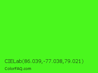 CIELab 86.039,-77.038,79.021 Color is a normal green color and the nearest color is Neon Green #39ff14. Hex code #4af71d and RGB value is rgb(74,247,29). In RGB color space, this color is composed of 29% red, 97% green, 11% blue, In CMYK color space, this color is composed of 70% cyan, 0% magenta, 88% yellow , 3% black , In HSL color space, this color has a hue angle of 108° , 93% saturation and 54% lightness.