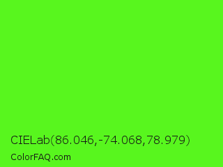 CIELab 86.046,-74.068,78.979 Color is a normal green color and the nearest color is Neon Green #39ff14. Hex code #58f61e and RGB value is rgb(88,246,30). In RGB color space, this color is composed of 35% red, 96% green, 12% blue, In CMYK color space, this color is composed of 64% cyan, 0% magenta, 88% yellow , 4% black , In HSL color space, this color has a hue angle of 104° , 92% saturation and 54% lightness.