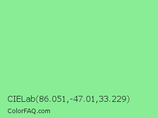 CIELab 86.051,-47.01,33.229 Color is a light green color and the nearest color is Light Green #90ee90. Hex code #89ed96 and RGB value is rgb(137,237,150). In RGB color space, this color is composed of 54% red, 93% green, 59% blue, In CMYK color space, this color is composed of 42% cyan, 0% magenta, 37% yellow , 7% black , In HSL color space, this color has a hue angle of 128° , 74% saturation and 73% lightness.