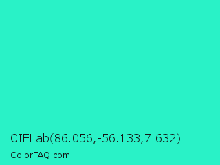 CIELab 86.056,-56.133,7.632 Color is a normal cyan color and the nearest color is Turquoise PWG #30d5c8. Hex code #29f2c7 and RGB value is rgb(41,242,199). In RGB color space, this color is composed of 16% red, 95% green, 78% blue, In CMYK color space, this color is composed of 83% cyan, 0% magenta, 18% yellow , 5% black , In HSL color space, this color has a hue angle of 167° , 89% saturation and 55% lightness.