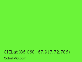 CIELab 86.068,-67.917,72.786 Color is a normal green color and the nearest color is Spring Frost #87ff2a. Hex code #6bf439 and RGB value is rgb(107,244,57). In RGB color space, this color is composed of 42% red, 96% green, 22% blue, In CMYK color space, this color is composed of 56% cyan, 0% magenta, 77% yellow , 4% black , In HSL color space, this color has a hue angle of 104° , 89% saturation and 59% lightness.