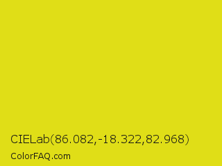 CIELab 86.082,-18.322,82.968 Color is a normal yellow color and the nearest color is Piss Yellow #e1e115. Hex code #e0de17 and RGB value is rgb(224,222,23). In RGB color space, this color is composed of 88% red, 87% green, 9% blue, In CMYK color space, this color is composed of 0% cyan, 1% magenta, 90% yellow , 12% black , In HSL color space, this color has a hue angle of 59° , 81% saturation and 48% lightness.
