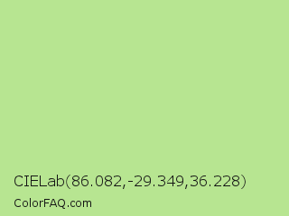 CIELab 86.082,-29.349,36.228 Color is a light green color and the nearest color is Granny Smith Apple #a8e4a0. Hex code #b7e591 and RGB value is rgb(183,229,145). In RGB color space, this color is composed of 72% red, 90% green, 57% blue, In CMYK color space, this color is composed of 20% cyan, 0% magenta, 37% yellow , 10% black , In HSL color space, this color has a hue angle of 93° , 62% saturation and 73% lightness.