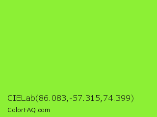 CIELab 86.083,-57.315,74.399 Color is a normal green color and the nearest color is Kiwi #8ee53f. Hex code #8cf035 and RGB value is rgb(140,240,53). In RGB color space, this color is composed of 55% red, 94% green, 21% blue, In CMYK color space, this color is composed of 42% cyan, 0% magenta, 78% yellow , 6% black , In HSL color space, this color has a hue angle of 92° , 86% saturation and 57% lightness.