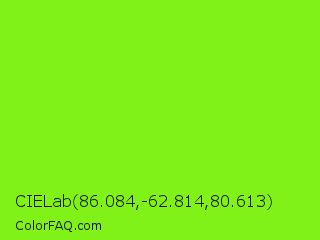 CIELab 86.084,-62.814,80.613 Color is a normal green color and the nearest color is Spring Frost #87ff2a. Hex code #80f217 and RGB value is rgb(128,242,23). In RGB color space, this color is composed of 50% red, 95% green, 9% blue, In CMYK color space, this color is composed of 47% cyan, 0% magenta, 90% yellow , 5% black , In HSL color space, this color has a hue angle of 91° , 89% saturation and 52% lightness.