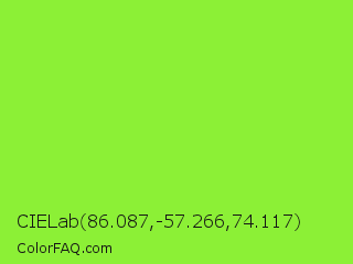 CIELab 86.087,-57.266,74.117 Color is a normal green color and the nearest color is Kiwi #8ee53f. Hex code #8cf036 and RGB value is rgb(140,240,54). In RGB color space, this color is composed of 55% red, 94% green, 21% blue, In CMYK color space, this color is composed of 42% cyan, 0% magenta, 78% yellow , 6% black , In HSL color space, this color has a hue angle of 92° , 86% saturation and 58% lightness.