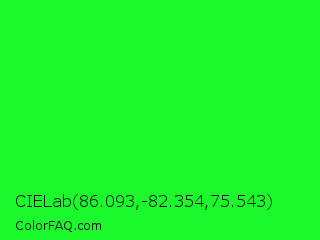 CIELab 86.093,-82.354,75.543 Color is a normal green color and the nearest color is Neon Green #39ff14. Hex code #1bf92d and RGB value is rgb(27,249,45). In RGB color space, this color is composed of 11% red, 98% green, 18% blue, In CMYK color space, this color is composed of 89% cyan, 0% magenta, 82% yellow , 2% black , In HSL color space, this color has a hue angle of 125° , 95% saturation and 54% lightness.
