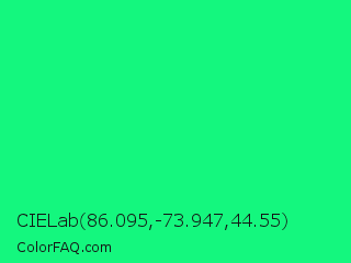 CIELab 86.095,-73.947,44.55 Color is a normal green color and the nearest color is Spring Green #00ff7f. Hex code #14f77e and RGB value is rgb(20,247,126). In RGB color space, this color is composed of 8% red, 97% green, 49% blue, In CMYK color space, this color is composed of 92% cyan, 0% magenta, 49% yellow , 3% black , In HSL color space, this color has a hue angle of 148° , 93% saturation and 52% lightness.