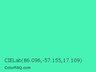 CIELab 86.096,-57.155,17.109 Color is a light green color and the nearest color is Eucalyptus #44d7a8. Hex code #47f2b5 and RGB value is rgb(71,242,181). In RGB color space, this color is composed of 28% red, 95% green, 71% blue, In CMYK color space, this color is composed of 71% cyan, 0% magenta, 25% yellow , 5% black , In HSL color space, this color has a hue angle of 159° , 87% saturation and 61% lightness.