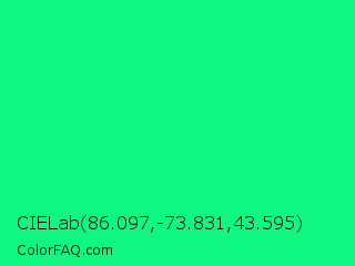 CIELab 86.097,-73.831,43.595 Color is a normal green color and the nearest color is Spring Green #00ff7f. Hex code #0ff780 and RGB value is rgb(15,247,128). In RGB color space, this color is composed of 6% red, 97% green, 50% blue, In CMYK color space, this color is composed of 94% cyan, 0% magenta, 48% yellow , 3% black , In HSL color space, this color has a hue angle of 149° , 94% saturation and 51% lightness.