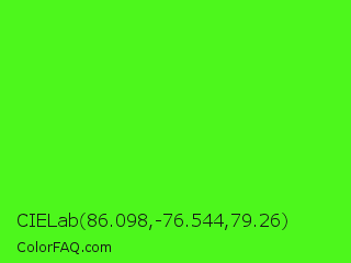CIELab 86.098,-76.544,79.26 Color is a normal green color and the nearest color is Neon Green #39ff14. Hex code #4df71c and RGB value is rgb(77,247,28). In RGB color space, this color is composed of 30% red, 97% green, 11% blue, In CMYK color space, this color is composed of 69% cyan, 0% magenta, 89% yellow , 3% black , In HSL color space, this color has a hue angle of 107° , 93% saturation and 54% lightness.