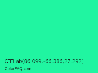 CIELab 86.099,-66.386,27.292 Color is a normal green color and the nearest color is Medium Spring Green #00fa9a. Hex code #20f5a1 and RGB value is rgb(32,245,161). In RGB color space, this color is composed of 13% red, 96% green, 63% blue, In CMYK color space, this color is composed of 87% cyan, 0% magenta, 34% yellow , 4% black , In HSL color space, this color has a hue angle of 156° , 91% saturation and 54% lightness.