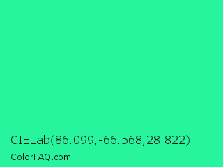 CIELab 86.099,-66.568,28.822 Color is a normal green color and the nearest color is Medium Spring Green #00fa9a. Hex code #26f59e and RGB value is rgb(38,245,158). In RGB color space, this color is composed of 15% red, 96% green, 62% blue, In CMYK color space, this color is composed of 84% cyan, 0% magenta, 36% yellow , 4% black , In HSL color space, this color has a hue angle of 155° , 91% saturation and 55% lightness.