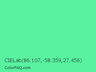 CIELab 86.107,-58.359,27.456 Color is a light green color and the nearest color is Medium Aquamarine #66ddaa. Hex code #59f2a1 and RGB value is rgb(89,242,161). In RGB color space, this color is composed of 35% red, 95% green, 63% blue, In CMYK color space, this color is composed of 63% cyan, 0% magenta, 33% yellow , 5% black , In HSL color space, this color has a hue angle of 148° , 85% saturation and 65% lightness.