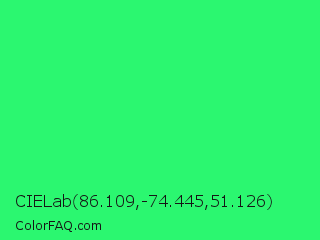 CIELab 86.109,-74.445,51.126 Color is a normal green color and the nearest color is UFO Green #3cd070. Hex code #2bf770 and RGB value is rgb(43,247,112). In RGB color space, this color is composed of 17% red, 97% green, 44% blue, In CMYK color space, this color is composed of 83% cyan, 0% magenta, 55% yellow , 3% black , In HSL color space, this color has a hue angle of 140° , 93% saturation and 57% lightness.