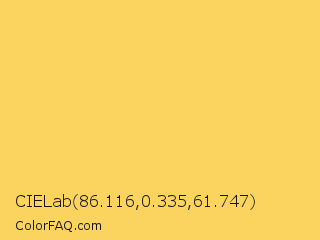 CIELab 86.116,0.335,61.747 Color is a light orange color and the nearest color is Dandelion Crayola #fed85d. Hex code #fad45e and RGB value is rgb(250,212,94). In RGB color space, this color is composed of 98% red, 83% green, 37% blue, In CMYK color space, this color is composed of 0% cyan, 15% magenta, 62% yellow , 2% black , In HSL color space, this color has a hue angle of 45° , 94% saturation and 67% lightness.