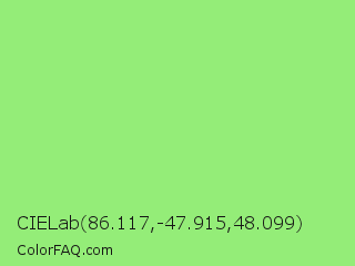 CIELab 86.117,-47.915,48.099 Color is a light green color and the nearest color is Light Green #90ee90. Hex code #94ed78 and RGB value is rgb(148,237,120). In RGB color space, this color is composed of 58% red, 93% green, 47% blue, In CMYK color space, this color is composed of 38% cyan, 0% magenta, 49% yellow , 7% black , In HSL color space, this color has a hue angle of 106° , 76% saturation and 70% lightness.
