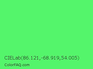 CIELab 86.121,-68.919,54.005 Color is a light green color and the nearest color is Screamin Green #66ff66. Hex code #54f56a and RGB value is rgb(84,245,106). In RGB color space, this color is composed of 33% red, 96% green, 42% blue, In CMYK color space, this color is composed of 66% cyan, 0% magenta, 57% yellow , 4% black , In HSL color space, this color has a hue angle of 128° , 89% saturation and 65% lightness.