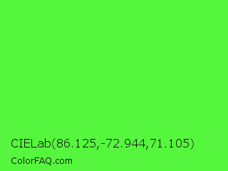 CIELab 86.125,-72.944,71.105 Color is a normal green color and the nearest color is Screamin Green #66ff66. Hex code #56f63e and RGB value is rgb(86,246,62). In RGB color space, this color is composed of 34% red, 96% green, 24% blue, In CMYK color space, this color is composed of 65% cyan, 0% magenta, 75% yellow , 4% black , In HSL color space, this color has a hue angle of 112° , 91% saturation and 60% lightness.