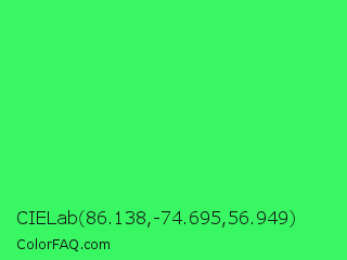 CIELab 86.138,-74.695,56.949 Color is a normal green color and the nearest color is UFO Green #3cd070. Hex code #38f763 and RGB value is rgb(56,247,99). In RGB color space, this color is composed of 22% red, 97% green, 39% blue, In CMYK color space, this color is composed of 77% cyan, 0% magenta, 60% yellow , 3% black , In HSL color space, this color has a hue angle of 134° , 92% saturation and 59% lightness.