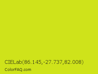 CIELab 86.145,-27.737,82.008 Color is a normal yellow color and the nearest color is Las Palmas #c6e610. Hex code #cfe31a and RGB value is rgb(207,227,26). In RGB color space, this color is composed of 81% red, 89% green, 10% blue, In CMYK color space, this color is composed of 9% cyan, 0% magenta, 89% yellow , 11% black , In HSL color space, this color has a hue angle of 66° , 79% saturation and 50% lightness.
