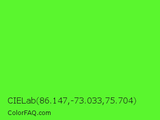 CIELab 86.147,-73.033,75.704 Color is a normal green color and the nearest color is Neon Green #39ff14. Hex code #5af62e and RGB value is rgb(90,246,46). In RGB color space, this color is composed of 35% red, 96% green, 18% blue, In CMYK color space, this color is composed of 63% cyan, 0% magenta, 81% yellow , 4% black , In HSL color space, this color has a hue angle of 107° , 92% saturation and 57% lightness.