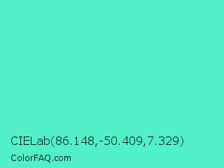 CIELab 86.148,-50.409,7.329 Color is a light cyan color and the nearest color is Turquoise #40e0d0. Hex code #52f0c8 and RGB value is rgb(82,240,200). In RGB color space, this color is composed of 32% red, 94% green, 78% blue, In CMYK color space, this color is composed of 66% cyan, 0% magenta, 17% yellow , 6% black , In HSL color space, this color has a hue angle of 165° , 84% saturation and 63% lightness.