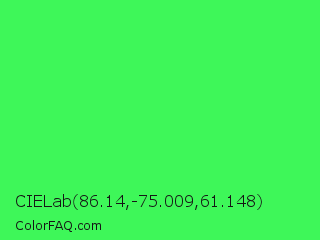 CIELab 86.14,-75.009,61.148 Color is a light green color and the nearest color is Screamin Green #66ff66. Hex code #3ef759 and RGB value is rgb(62,247,89). In RGB color space, this color is composed of 24% red, 97% green, 35% blue, In CMYK color space, this color is composed of 75% cyan, 0% magenta, 64% yellow , 3% black , In HSL color space, this color has a hue angle of 129° , 92% saturation and 61% lightness.
