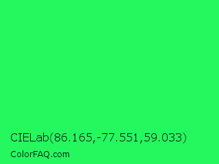 CIELab 86.165,-77.551,59.033 Color is a normal green color and the nearest color is Malachite #0bda51. Hex code #24f85e and RGB value is rgb(36,248,94). In RGB color space, this color is composed of 14% red, 97% green, 37% blue, In CMYK color space, this color is composed of 85% cyan, 0% magenta, 62% yellow , 3% black , In HSL color space, this color has a hue angle of 136° , 94% saturation and 56% lightness.