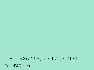 CIELab 86.168,-25.171,3.013 Color is a light green color and the nearest color is Aqua Island #a1dad7. Hex code #a2e5d1 and RGB value is rgb(162,229,209). In RGB color space, this color is composed of 64% red, 90% green, 82% blue, In CMYK color space, this color is composed of 29% cyan, 0% magenta, 9% yellow , 10% black , In HSL color space, this color has a hue angle of 162° , 56% saturation and 77% lightness.