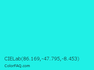 CIELab 86.169,-47.795,-8.453 Color is a normal cyan color and the nearest color is Loeen #15f2fd. Hex code #1ff0e6 and RGB value is rgb(31,240,230). In RGB color space, this color is composed of 12% red, 94% green, 90% blue, In CMYK color space, this color is composed of 87% cyan, 0% magenta, 4% yellow , 6% black , In HSL color space, this color has a hue angle of 177° , 87% saturation and 53% lightness.