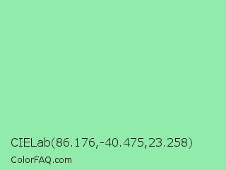 CIELab 86.176,-40.475,23.258 Color is a light green color and the nearest color is Teal Deer #99e6b3. Hex code #91ebaa and RGB value is rgb(145,235,170). In RGB color space, this color is composed of 57% red, 92% green, 67% blue, In CMYK color space, this color is composed of 38% cyan, 0% magenta, 28% yellow , 8% black , In HSL color space, this color has a hue angle of 137° , 69% saturation and 75% lightness.
