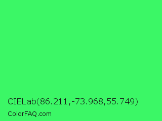 CIELab 86.211,-73.968,55.749 Color is a normal green color and the nearest color is UFO Green #3cd070. Hex code #3bf766 and RGB value is rgb(59,247,102). In RGB color space, this color is composed of 23% red, 97% green, 40% blue, In CMYK color space, this color is composed of 76% cyan, 0% magenta, 59% yellow , 3% black , In HSL color space, this color has a hue angle of 134° , 92% saturation and 60% lightness.
