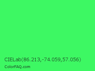 CIELab 86.213,-74.059,57.056 Color is a normal green color and the nearest color is UFO Green #3cd070. Hex code #3df763 and RGB value is rgb(61,247,99). In RGB color space, this color is composed of 24% red, 97% green, 39% blue, In CMYK color space, this color is composed of 75% cyan, 0% magenta, 60% yellow , 3% black , In HSL color space, this color has a hue angle of 132° , 92% saturation and 60% lightness.