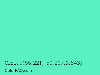 CIELab 86.221,-50.207,9.543 Color is a light green color and the nearest color is Turquoise #40e0d0. Hex code #59f0c4 and RGB value is rgb(89,240,196). In RGB color space, this color is composed of 35% red, 94% green, 77% blue, In CMYK color space, this color is composed of 63% cyan, 0% magenta, 18% yellow , 6% black , In HSL color space, this color has a hue angle of 163° , 83% saturation and 65% lightness.