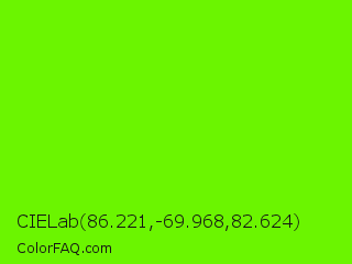 CIELab 86.221,-69.968,82.624 Color is a normal green color and the nearest color is Bright Green #66ff00. Hex code #6bf500 and RGB value is rgb(107,245,0). In RGB color space, this color is composed of 42% red, 96% green, 0% blue, In CMYK color space, this color is composed of 56% cyan, 0% magenta, 100% yellow , 4% black , In HSL color space, this color has a hue angle of 94° , 100% saturation and 48% lightness.