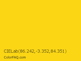 CIELab 86.242,-3.352,84.351 Color is a normal yellow color and the nearest color is Candlelight #fcd917. Hex code #fad615 and RGB value is rgb(250,214,21). In RGB color space, this color is composed of 98% red, 84% green, 8% blue, In CMYK color space, this color is composed of 0% cyan, 14% magenta, 92% yellow , 2% black , In HSL color space, this color has a hue angle of 51° , 96% saturation and 53% lightness.