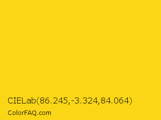 CIELab 86.245,-3.324,84.064 Color is a normal yellow color and the nearest color is Candlelight #fcd917. Hex code #fad617 and RGB value is rgb(250,214,23). In RGB color space, this color is composed of 98% red, 84% green, 9% blue, In CMYK color space, this color is composed of 0% cyan, 14% magenta, 91% yellow , 2% black , In HSL color space, this color has a hue angle of 50° , 96% saturation and 54% lightness.